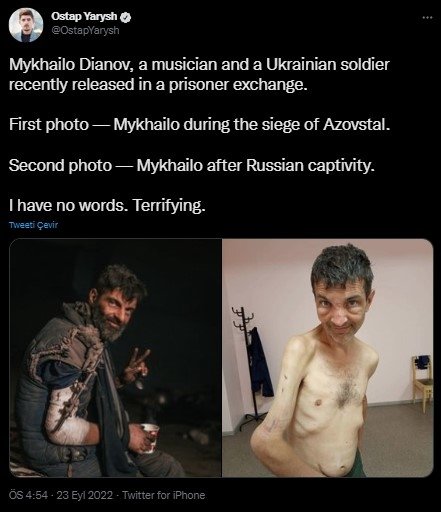 Yarysh, söz konusu fotoğrafları, "Müzisyen ve Ukraynalı bir asker olan Mykhailo Dianov, kısa süre önce bir mahkum değişiminde serbest bırakıldı. İlk fotoğraf, Azovstal kuşatması sırasında çekildi. İkinci fotoğraf, Rus esaretinden sonra çekildi. Sözüm yok korkutucu." ifadeleriyle paylaştı.