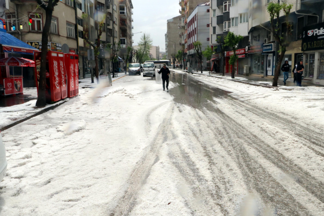 Eskişehir'de öğleden sonra başlayan sağanak, doluya dönüştü. Yaklaşık yarım saat süren doluda cadde ve sokaklar bembeyaz oldu.