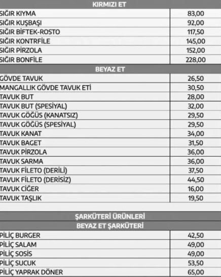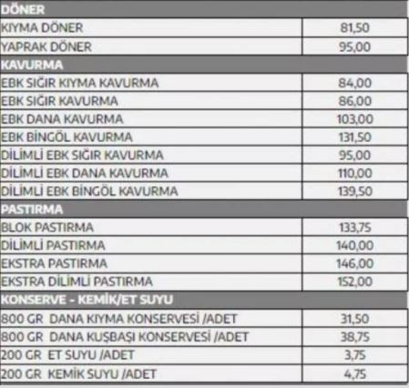 Kurumun sitesinde yer alan yeni listeye göre sığır kıymanın kilosu yüzde 48,2 zamla 83 liraya yükseldi.