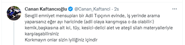 Kaftancıoğlu, "Sevgili emniyet mensupları bir Adli Tıpçının evinde, iş yerinde arama yaparsanız eğer ayı haricinde (adli olaya karışmışsa o da olabilir ) kemik,başkasına ait kıl, tüy, kesici-delici alet ve ateşli silah materyalleriyle karşılaşabilirsiniz. Korkmayın onlar sizin iyiliğiniz içindir" ifadelerini kullandı.