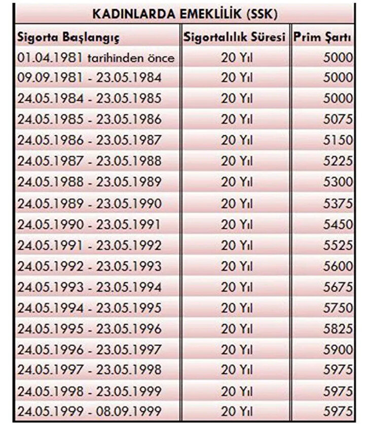 Emekli olabilmek için işe başlama tarihine göre 5 bin ile 5 bin 975 gün arasında değişen prim günü şartını da tamamlamak gerekiyor. (Tablo: Kadınların emeklilik için prim gün sayıları)