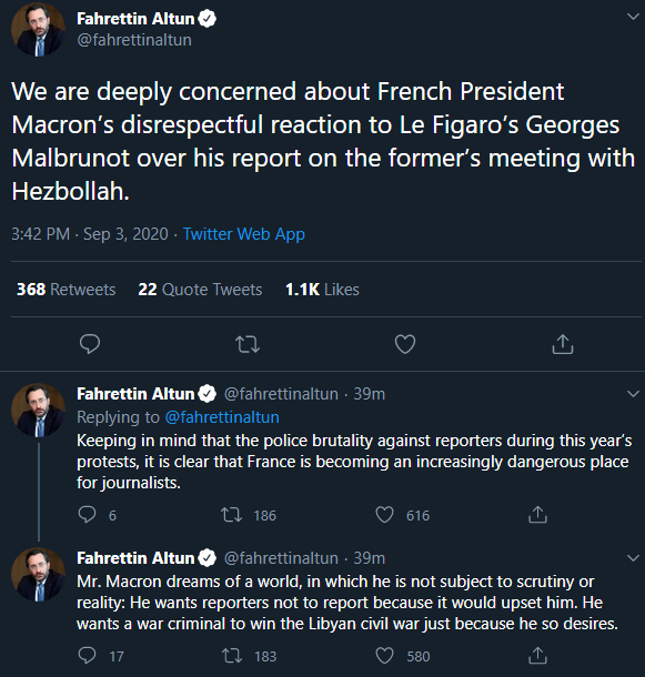 "Fransa Cumhurbaşkanı Macron'un Le Figaro'nun Georges Malbrunot'una daha önceki Hizbullah'la görüşmesine ilişkin raporundan ötürüverdiği saygısız tepkiden endişe duyuyoruz."