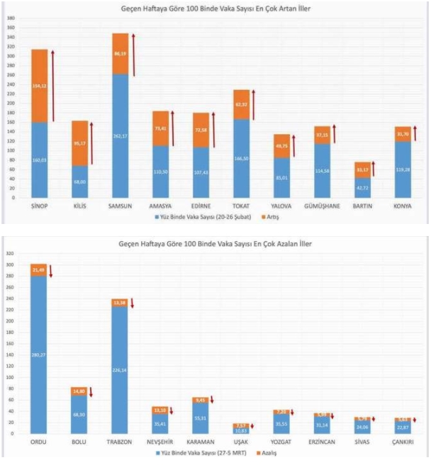 Sağlık Bakanı Fahrettin Koca, resmi sosyal medya hesabından 100 bin nüfusta vaka görünme oranı çok artan ve azalan illeri açıkladı. Bakan Koca yaptığı paylaşımda, “Son hafta 100 bin nüfusta vaka görünme oranı en çok artan illerimiz: Sinop, Kilis, Samsun, Amasya ve Edirne. En çok azalan illerimiz: Ordu, Bolu, Trabzon, Nevşehir ve Karaman. Birlikte tedbirlere uyarak tüm illerimizi mavi kategoriye sokalım” ifadelerini kullandı.