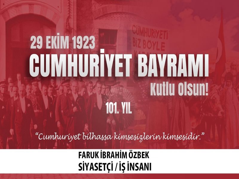 Özbek, yayımladığı kutlama mesajında şu ifadelere yer verdi; “Bu sene, Cumhuriyetimizin 101 yılına ulaşmasının gurur ve coşkusunu hep birlikte yaşıyoruz. 29 Ekim 1923 tarihinde Gazi Mustafa Kemal Atatürk ve silah arkadaşlarının önderliğinde kurulan Türkiye Cumhuriyeti, bağımsızlık mücadelemizin zaferle sonuçlanmasının bir simgesidir. Bu zaferi kutlamak ve bu büyük mirasa sahip çıkmak bizim en büyük vazifemizdir.