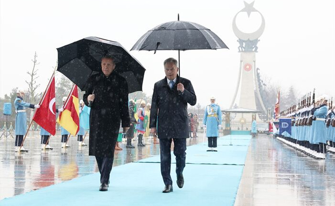 Yağmur altında gerçekleşen karşılama törenin ardından Erdoğan ve Niinistö, merdivenlerde Türkiye ve Finlandiya bayrakları önünde gazetecilere poz verdi.