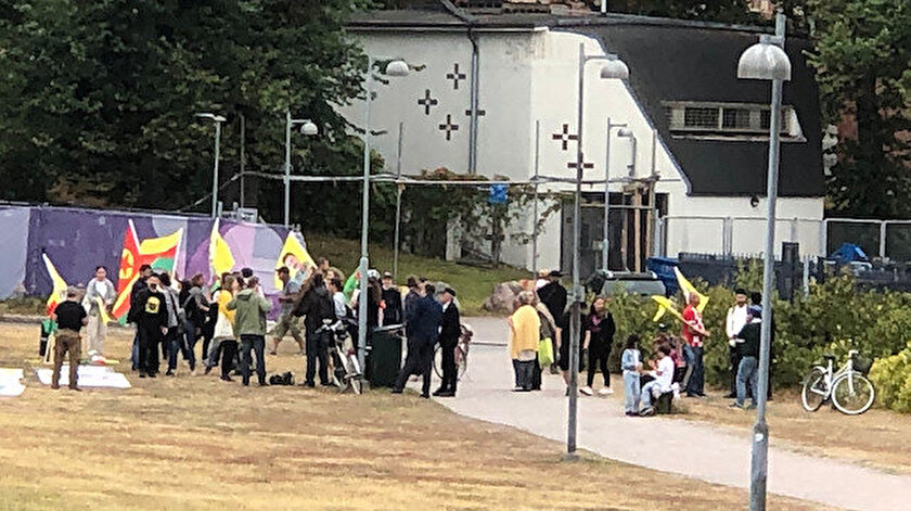 Türkiye, Finlandiya ve İsveç'in NATO Madrid Zirvesi'nde imzaladığı Üçlü Muhtıra çerçevesinde kurulan Daimi Ortak Mekanizma'nın ilk toplantısının Finlandiya'da yapılmasına da karşı çıkan terör yandaşları, gösteride terör örgütü YPG/PKK'yı simgeleyen bez parçaları taşırken terör örgütü elebaşı Abdullah Öcalan'ın posterini açtı.