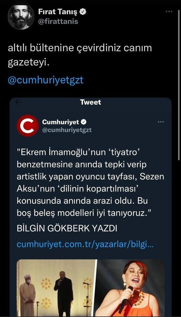 "Ekrem İmamoğlu'nun 'tiyatro' benzetmesine anında tepki verip artistlik yapan oyuncu tayfası, Sezen Aksu'nun 'dilinin kopartılması' konusunda arazi oldu. Bu boş beleş modelleri iyi tanıyoruz."