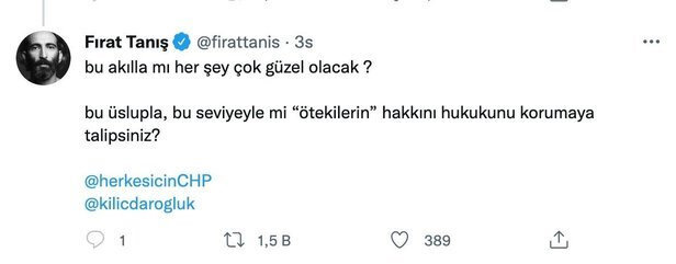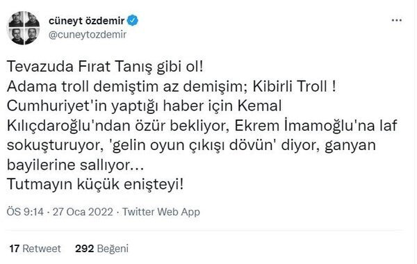 "Tevazuda Fırat Tanış gibi ol! Adama troll demiştim az demişim; Kibirli Troll ! Cumhuriyet'in yaptığı haber için Kemal Kılıçdaroğlu'ndan özür bekliyor, Ekrem İmamoğlu'na laf sokuşturuyor, 'gelin oyun çıkışı dövün' diyor, ganyan bayilerine sallıyor... Tutmayın küçük enişteyi!"
