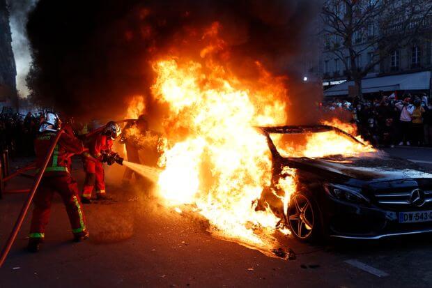 Yasa tasarısına ve polis şiddetine karşı pankart taşıyan göstericiler, Fransa Cumhurbaşkanı Emmanuel Macron'un istifası için sloganlar attı. Bastille Meydanı'nda bulunan Merkez Bankası, bir grup gösterici tarafından ateşe verildi. Alevler binanın içine girmese de bankanın çevresinde bukunan gazete büfesi, bar ve kafe alev aldı. Tansiyon yükselince göstericiler pek çok aracı ateşe verdi.