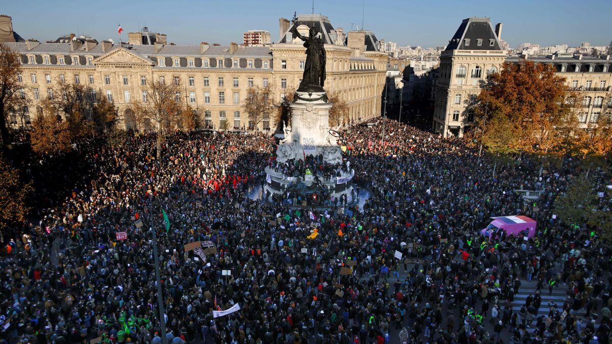 Fransa'da yeni güvenlik yasasına karşı çıkan vatandaşlar sokağa dökülünce yüze yakın şehir adeta savaş alanına döndü. Merkez bankası, kafeler ve arabalar ateşe verilirken, vatandaşlar Cumhurbaşkanı Emmanuel Macron'u istifaya davet etti. Polis ve halk arasında şiddetli kavgalar yaşandı.