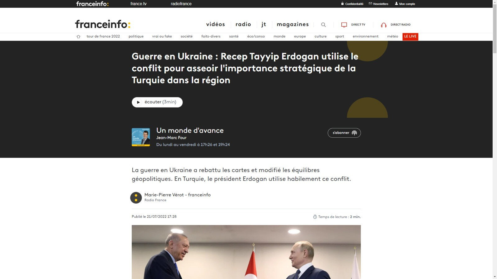 Ukrayna Rusya savaşında Türkiye'nin duruşu ve barış için verdiği çaba Avrupa'da övgü almaya devam ediyor. Son olarak Fransız kamu yayıncısı France Info'da yayımlanan haberde Cumhurbaşkanı Recep Tayyip Erdoğan'ın Türkiye'yi daima yücelttiği vurgulandı. Haberde şu ifadelere yer verildi: "Ukrayna'daki savaş, kartları yeniden karıştırdı ve jeopolitik dengeleri değiştirdi. Türkiye Cumhurbaşkanı Erdoğan bunu ustaca kullanıyor. Ülkenin büyüklüğünü yüceltmek için hiçbir fırsatı kaçırmıyor.