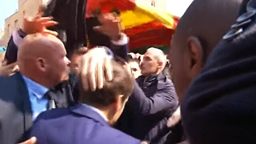Atılan domatesler, biri Macron'un yakın koruması iki kişiye isabet etti.