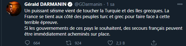 Darmanin, mesajında depremi korkunç bir sınav olarak nitelendirerek Fransa'nın Türk ve Yunan halklarının yanında olduğunu belirtti. Ülkelerin hükümetlerinden talep gelmesi durumundan Fransız yardımlarının bölgeye gönderileceğini belirtti.
