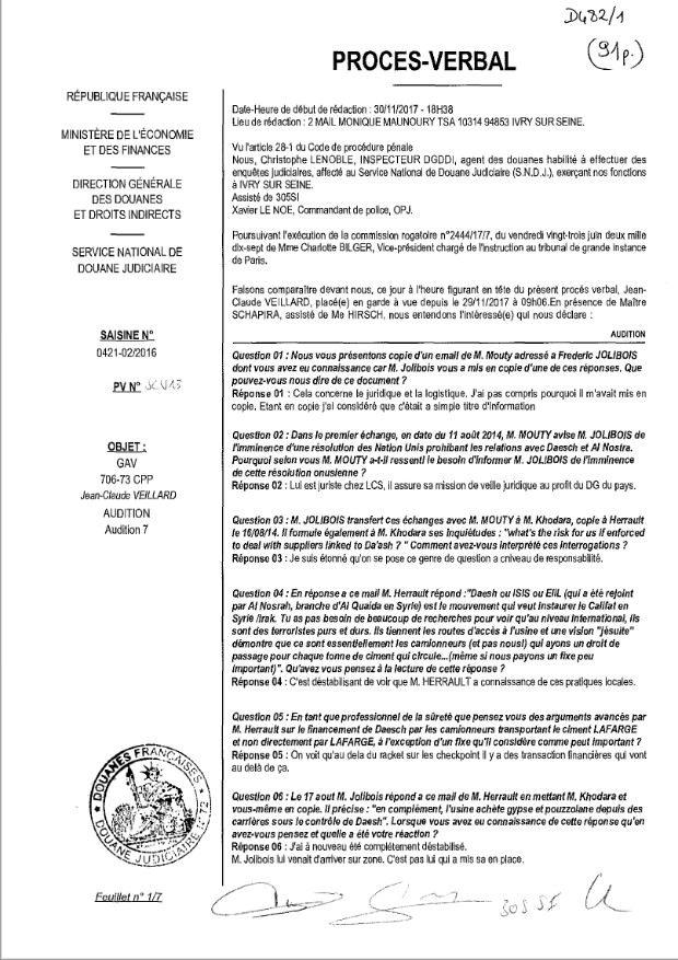 Lafarge’ın terör örgütlerine finansman sağlayarak insanlığa karşı suç işlemekle suçlandığı dönemde şirketin güvenlik müdürü Veillard, 30 Kasım 2017'de polise ifade verdi.