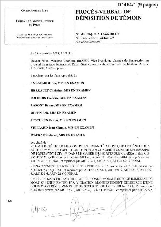 Lafarge-terör örgütü ilişkilerinin skandal olarak Fransa gündemine gelmesi ve konunun mahkemeye yansımasının ardından 18 Kasım 2018’de AM 02 kod isimli istihbarat mensubu, mahkemede ifade verdi.