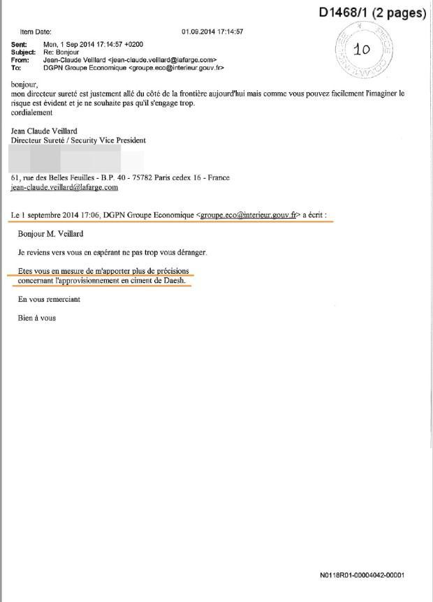Şirket yetkilisi Veillard, mailinde Lafarge'ın Suriye'de halen aktif olduğunu ve çalışmalarının devam edebilmesi için “yerel aktörlerle” ilişki kurması gerektiğini belirtti. Güvenlik müdürü, istihbarat servisine, basında kendileri hakkında bazı olumsuz yayınlar yapıldığını belirterek, yöneticilerinin ve genel merkezin ne kadar risk altında olduğunu sordu.