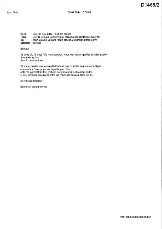 Lafarge Güvenlik Müdürü Veillard ile Fransız İçişleri Bakanlığı istihbaratı arasındaki e-posta trafiğinde 1 Eylül 2014’te yapılan yazışmalarda DEAŞ’a çimento gönderilmesi işinin ayrıntıları ele alındı.