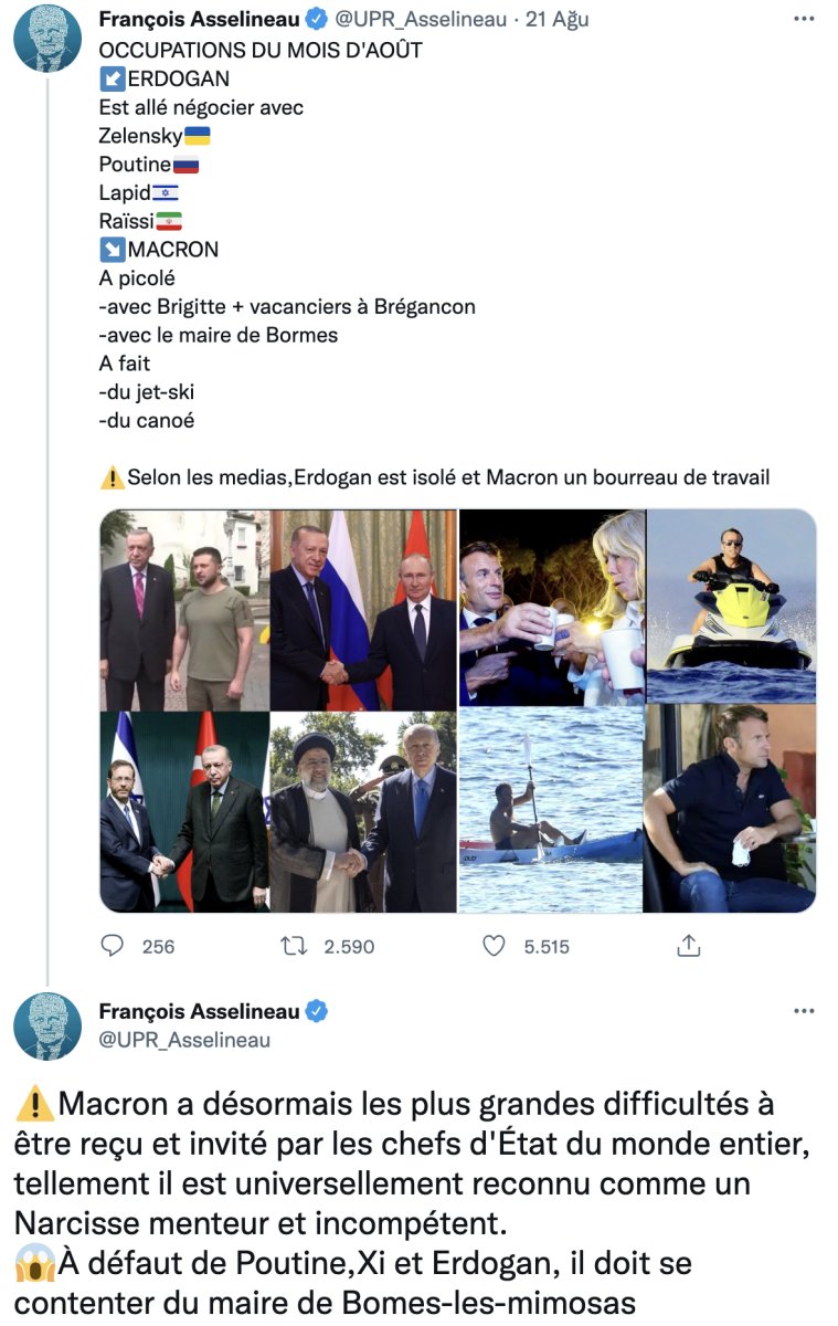 François Asselineau, bir tarafa Cumhurbaşkanı Erdoğan'ın temaslarını koyarken, diğer tarafada, Macron'un tatil fotoğraflarını paylaşarak, medyaya göre Erdoğan tecrit edilmiş Macron ise işkolik dedi.