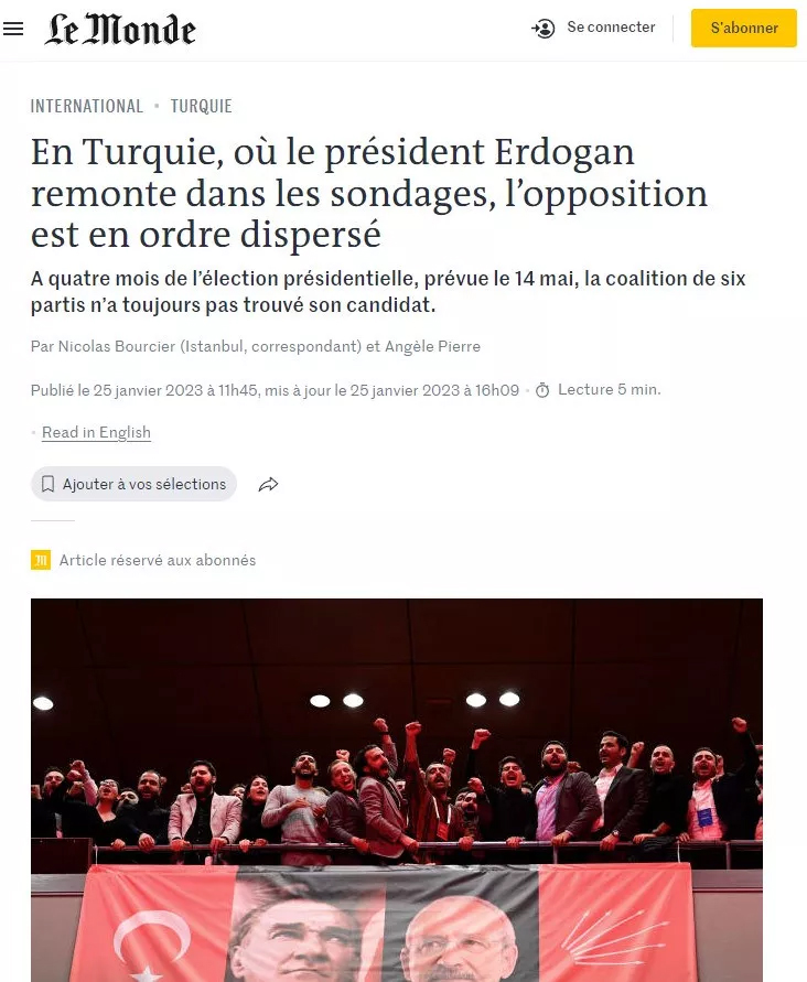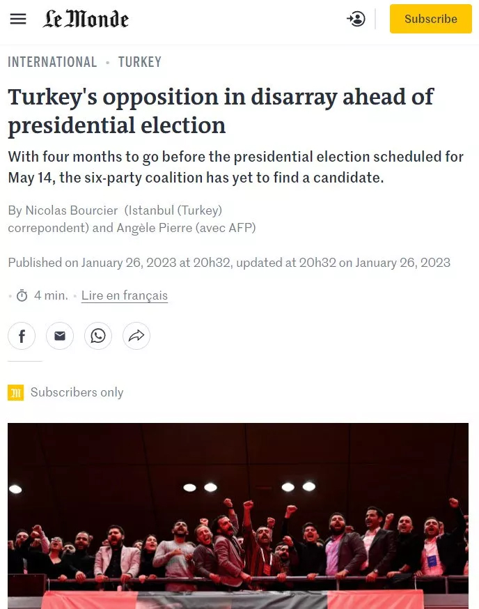 İngilizce metininde “Cumhurbaşkanlığı seçimi öncesi Türkiye muhalefeti darmadağın”, Fransızca metininde “Cumhurbaşkanı Erdoğan'ın anketlerde yükseldiği Türkiye'de muhalefet kargaşa içinde” başlığı atan Le Monde, enflasyonun Erdoğan’ı zor durumda bırakacağını ve yıpratacağını ancak muhalefetin darmadağın olduğunu yazdı.