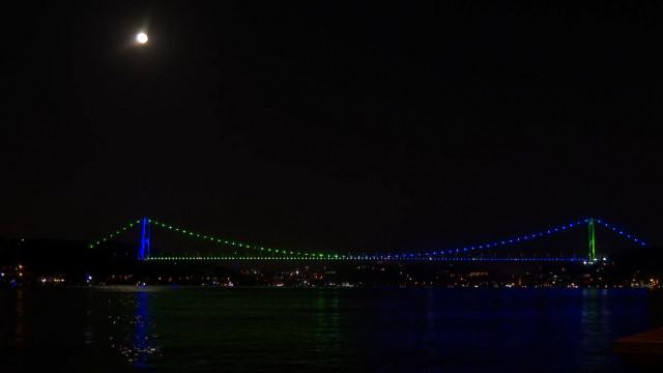Önemli günlerde renk ve ışık gösterilerine sahne olan İstanbul'un simge noktalarından FSM Köprüsü, Dünya Hipertansiyon Günü dolayısıyla farkındalık oluşturulması için mavi ve yeşil renkle aydınlatıldı.