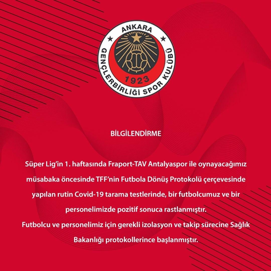 Gençlerbirliği Spor Kulübü Resmi Twitter hesabı, yaptığı paylaşımla kamuoyunu bilgilendirdi. Yapılan bilgilendirme doğrultusunda biri futbolcu, diğeri kulüpte görevli personellerden biri olmak üzere toplamda 2 kişide koronavirüs testinin pozitif çıktığı bilgisi duyuruldu.