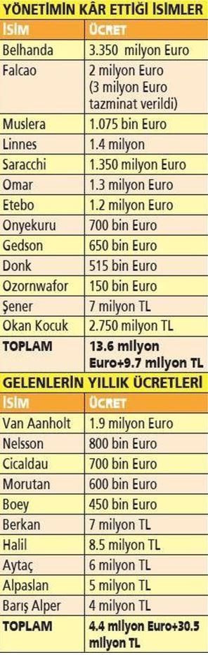 Kaptan Muslera da 3.575 milyon Euro olan parasını 2.5 milyon Euro'ya indirdi. Bu transfer döneminde bütçede 70 milyon TL yer açan sarı kırmızılı yönetim, 8 Eylül'e kadar Babel'i de göndermeye çalışırken, Aslan'ın maaş seviyesi yıllar sonra 40 milyon Euro'nun altına çekildi.