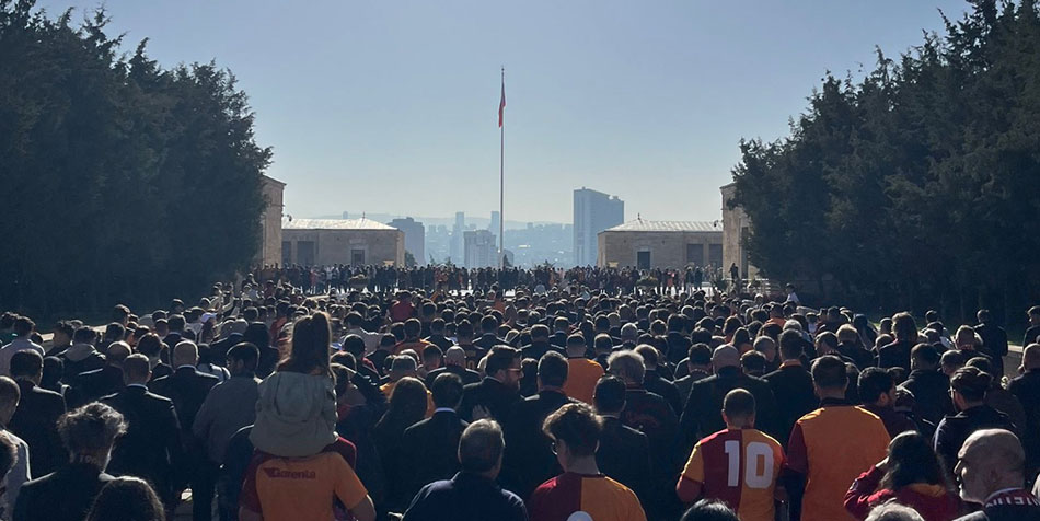 Sarı-kırmızılı heyet, Aslanlı Yol'dan yürüyerek Atatürk'ün mozolesine geldi. Dursun Özbek'in, mozoleye çelenk bırakmasının ardından saygı duruşunda bulunuldu.