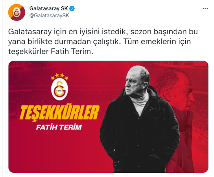 Sarı Kırmızılı kulübün paylaşımında, "Galatasaray için en iyisini istedik, sezon başından bu yana birlikte durmadan çalıştık. Tüm emeklerin için teşekkürler Fatih Terim." ifadelerine yer verildi.