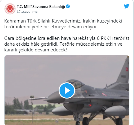 Milli Savunma Bakanlığı (MSB) Gara bölgesine icra edilen hava harekâtıyla 6 PKK’lı terörist daha etkisiz hâle getirildi. Terörle mücadelemiz etkin ve kararlı şekilde devam edecek!