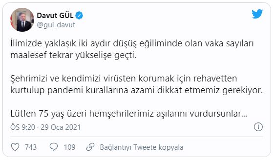 ''Şehrimizi ve kendimizi virüsten korumak için rehavetten kurtulup pandemi kurallarına azami dikkat etmemiz gerekiyor. Lütfen 75 yaş üzeri hemşehrilerimiz aşılarını vurdursunlar…''