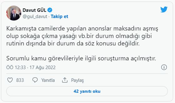 Konunun incelendiğini bildiren Gül, "Karkamış'ta camilerde yapılan anonslar maksadını aşmış olup sokağa çıkma yasağı gibi bir durum olmadığı gibi rutinin dışında bir durum da söz konusu değildir. Sorumlu kamu görevlileriyle ilgili soruşturma açılmıştır." ifadelerini kullandı.