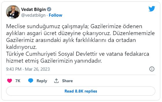 Çalışma ve Sosyal Güvenlik Bakanı Vedat Bilgin, sosyal medya hesabından yaptığı paylaşımda, "Meclis'e sunduğumuz çalışmayla gazilerimize ödenen aylıkları asgari ücret düzeyine çıkarıyoruz. Düzenlememizle gazilerimiz arasındaki aylık farklılıklarını da ortadan kaldırıyoruz. Türkiye Cumhuriyeti sosyal devlettir ve vatana fedakarca hizmet etmiş gazilerimizin yanındadır." ifadelerini kullandı.