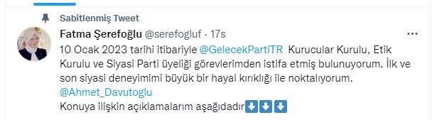 Gelecek Partisi Kurucular Kurulu ve Etik Kurulu Üyesi Fatma Şerefoğlu partisinden istifa etti.