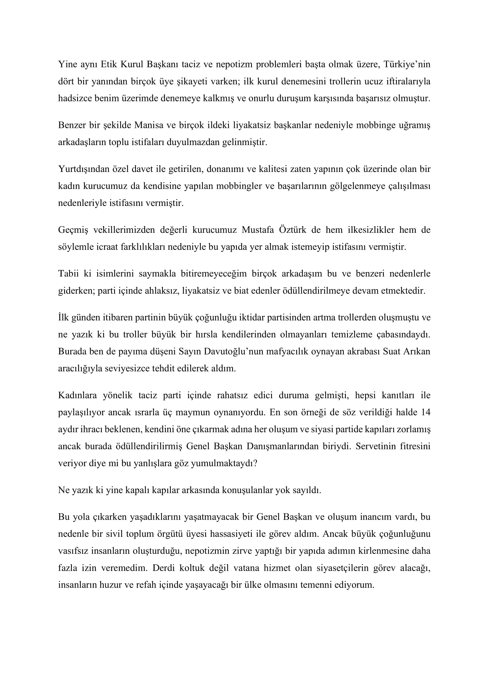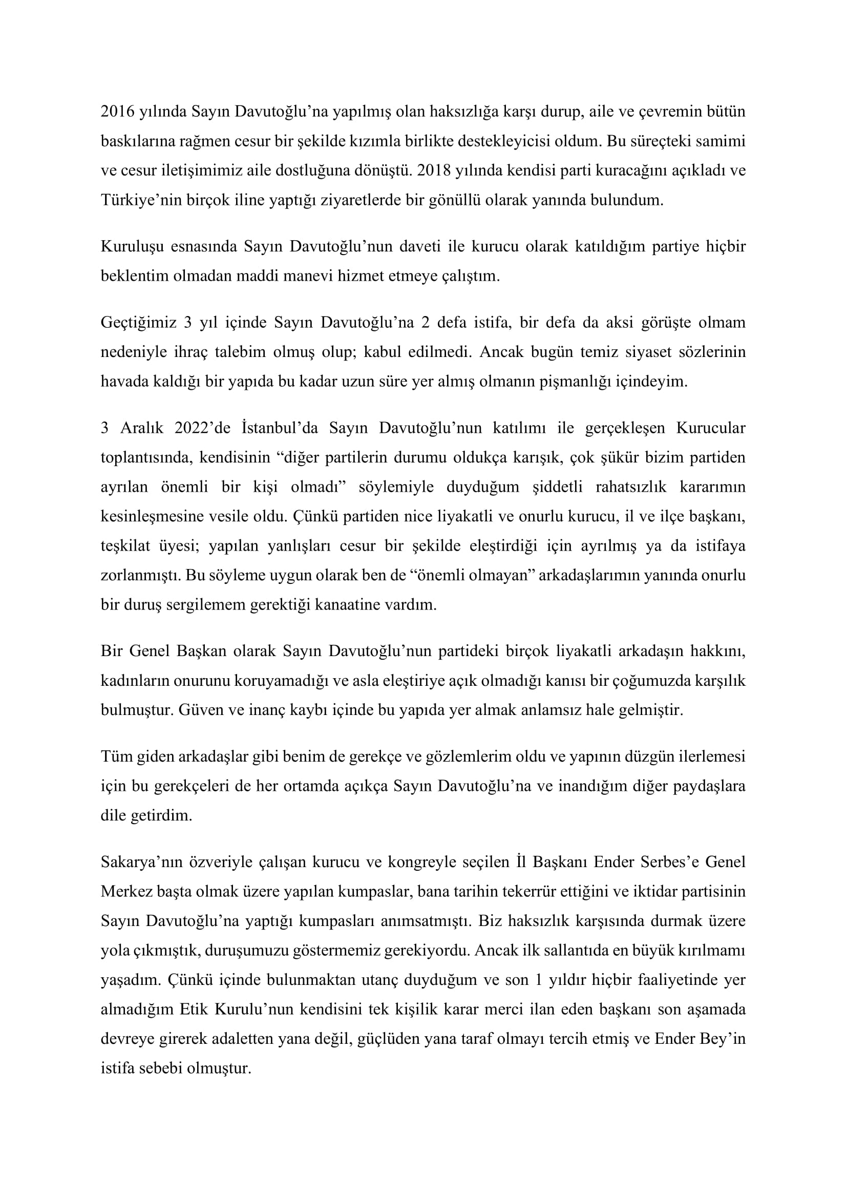 İstifasına ilişkin 2 sayfalık açıklama yayımlayan Şerefoğlu zehir zemberek açıklamalarda bulundu.