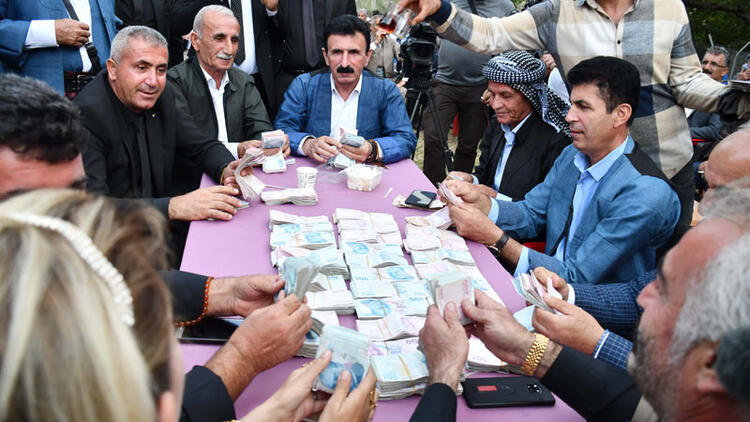 Parayla birlikte gelin ve damada toplamda 1 milyon 150 bin TL'lik takı takıldı. Düğün yemeğinde 950 kilo da et kullanıldı.