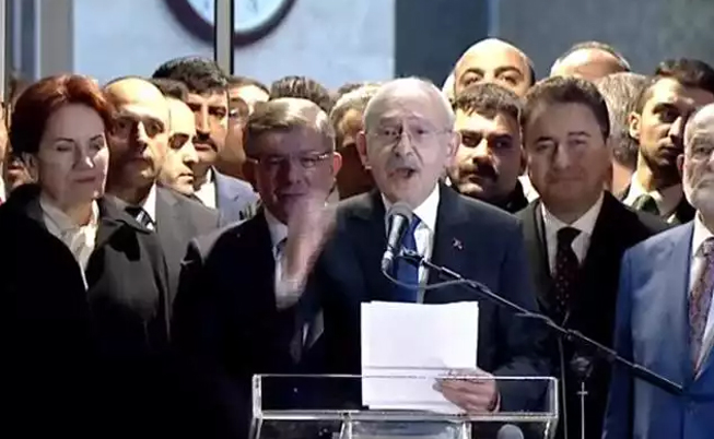 Saadet Partisi Genel Başkanı Temel Karamollaoğlu, partisinin ev sahipliğinde düzenlenen “Liderler Buluşması”nın ardından, 5 genel başkanla beraber partisinin genel merkezi önünde açıklama yaptı. Karamollaoğlu, CHP Genel Başkanı Kemal Kılıçdaroğlu’nun Millet İttifakı’nın cumhurbaşkanı adayı olduğunu duyurdu. Karamollaoğlu’nun ardından toplanan kalabalığa hitaben konuşma yapan Kılıçdaroğlu, Türkiye’nin bütün renklerini aynı sofrada buluşturmak için yola çıktıklarını belirtti. Kılıçdaroğlu şöyle devam etti: Bu sofra Halil İbrahim Sofrası’dır. Halil İbrahim Sofrası, komşusu açken tok yatmamaktır, Halil İbrahim Sofrası tek bir çocuğun dahi yatağa aç girmemesidir. Halil İbrahim Sofrası, zulmün sona ermesi, hakkın, hukukun ve adaletin hakim kılınması demektir. Bizim soframız barışın ve kardeşliğin sofrasıdır.