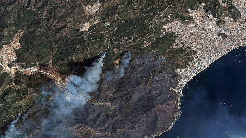 Söndürme çalışmaları aralıksız devam ederken Türkiye'nin yüksek çözünürlüklü yerli keşif uydusu Göktürk-1 ve Göktürk-2 Manavgat ve Marmaris'teki orman yangınlarını görüntüledi.