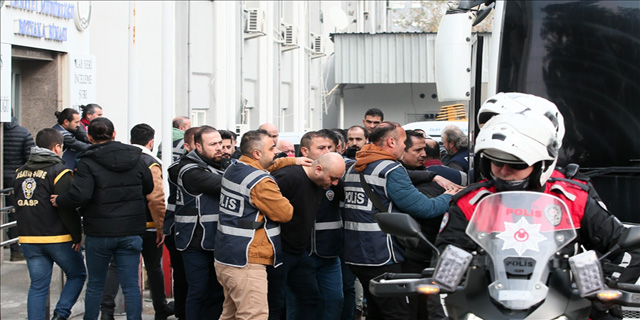 İzmir Cumhuriyet Başsavcılığının başlattığı soruşturma kapsamında gözaltına alınan ve emniyetteki ifade işlemi tamamlanan şüphelilerin sevki sırasında geniş güvenlik önlemi alındı.