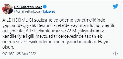 "Aile hekimliği sözleşme ve ödeme yönetmeliğinde yapılan değişiklik Resmi Gazete'de yayımlandı. Bu önemli gelişme ile, Aile Hekimlerimiz ve ASM çalışanlarımız kendileriyle ilgili mevzuatlar çerçevesinde taban ek ödemesi ve teşvik ödemesinden yararlanacaklar. Hayırlı olsun"