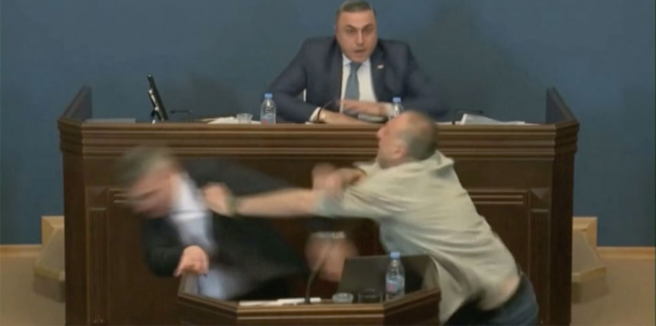 İktidardaki Gürcü Hayali Partisi'nin meclis çoğunluk lideri Mamuka Mdinaradze parlamento hukuk komitesindeki oturumda tasarıyı savunurken, muhalif milletvekili Aleko Elisashvili kürsüye koşarak Mdinaradze'nin kafasına yumruk attı.