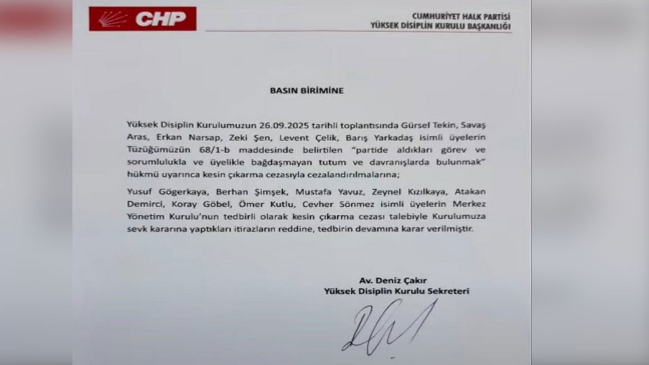 CHP Genel Başkaın Özgür Özel'in isteğiyle toplanan CHP Yüksek Disiplin Kurulu partinin çok sayıda ağır topunun tek kalemde üstünü çizdi. Kurul, Gürsel Tekin, Berhan Şimşek, Barış Yarkadaş, Savaş Aras, Erkan Narsap, Zeki Şen ve Levent Çelik'in ihraç edilmesine karar verdi.