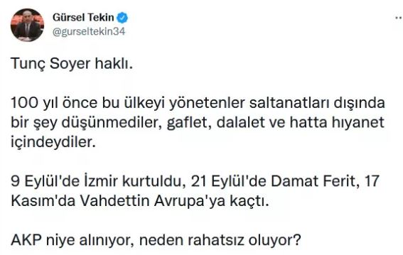 "Tunç Soyer haklı. 100 yıl önce bu ülkeyi yönetenler saltanatları dışında bir şey düşünmediler, gaflet, dalalet ve hatta hıyanet içindeydiler."