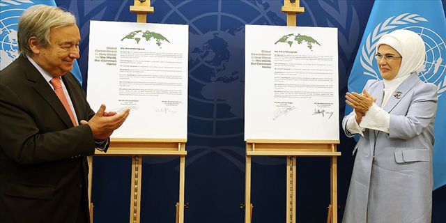 Emine Erdoğan ve Guterres, New York'taki BM Genel Merkezi'nde iklim kriziyle mücadele kapsamında Küresel Sıfır Atık İyi Niyet Beyanı'nı imzaladı. Bu çerçevede Emine Erdoğan'ın BM çatısı altında sıfır atığı hedefleyen çalışmanın küresel liderliğini yürüteceği belirtildi.