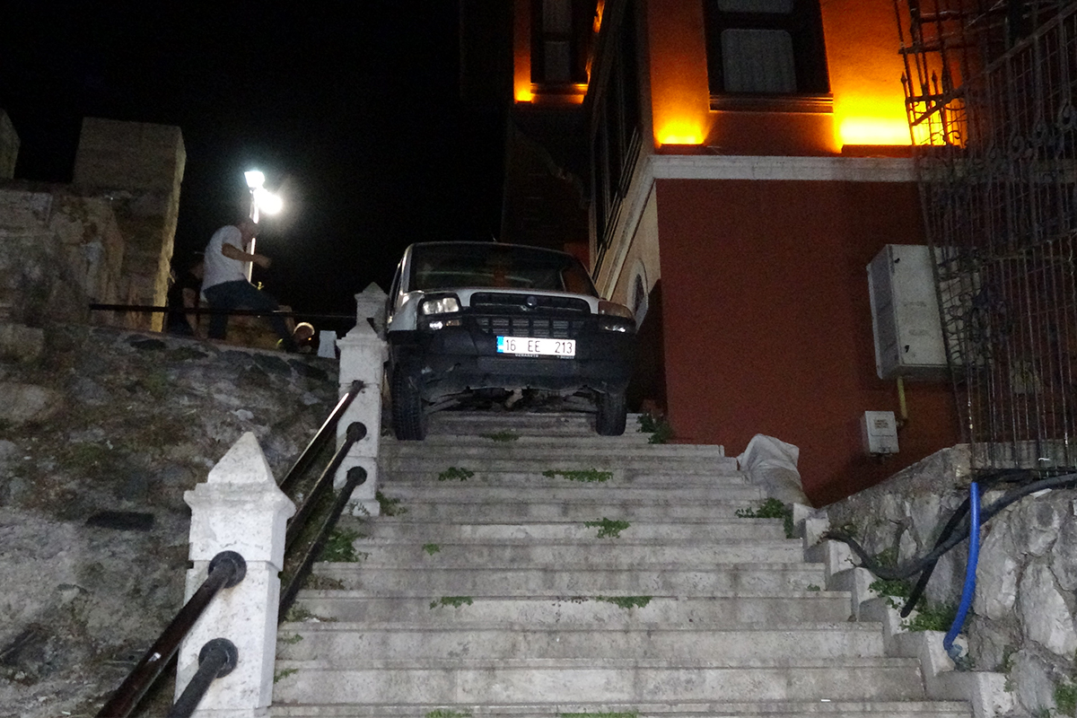 Olay, Bursa'nın Merkez Osmangazi ilçesi Tophane surlarında meydana geldi. Edinilen bilgiye göre 16 EE 213 plakalı hafif ticari bir araç Tophane surlarında duvar ile demir korkuluğun arasına sıkıştı. Çevrede bulunan otelin çalışanları hemen sıkışan hafif ticari aracın yanına gittiler. Herhangi bir yara almayan sürücü çevredekilerinin yardımıyla araçtan çıkarıldı.