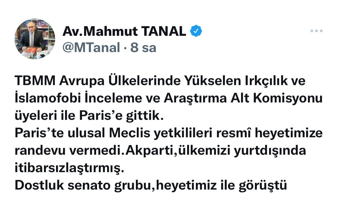 TBMM İnsan Haklarını İnceleme Komisyonu bünyesindeki Avrupa Ülkelerinde Yükselen Irkçılık ve İslamofobi İnceleme ve Araştırma Alt Komisyonu, Fransa'nın başkenti Paris'te çeşitli temaslarda bulundu. Paris'e giden komisyon heyetinde yer alan CHP İstanbul Milletvekili Mahmut Tanal, sosyal medya paylaşımında Paris'te komisyonun Meclisten randevu alamadığını öne sürdü. Tanal, “Paris'te Ulusal Meclis yetkilileri resmi heyetimize randevu vermedi. AK Parti, ülkemizi yurt dışında itibarsızlaştırmış” dedi.
