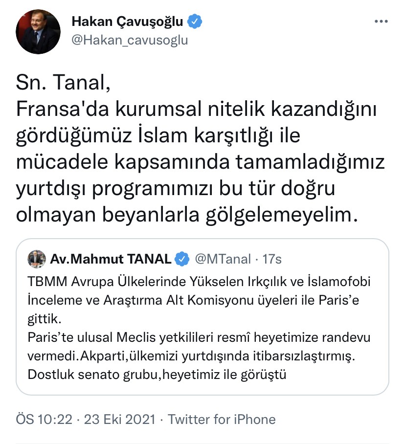 "Sayın Tanal, Fransa'da kurumsal nitelik kazandığını gördüğümüz İslam karşıtlığı ile mücadele kapsamında tamamladığımız yurtdışı programımızı bu tür doğru olmayan beyanlarla gölgelemeyelim. Başkanlığını yürüttüğüm Komisyon çalışmalarımız çerçevesinde davet ettiğimiz Senato Dostluk Grubu üyeleriyle Paris Büyükelçiliğimizde bir araya geldik. Planladığımız gibi Fransa Ulusal Meclisinde Türkiye Dostluk Grubu üyesi Dumas Frédérique ile de görüştük. Acaba siz başka bir programda mıydınız? Meclisimizin de, ülkemizin de itibarı yücedir."