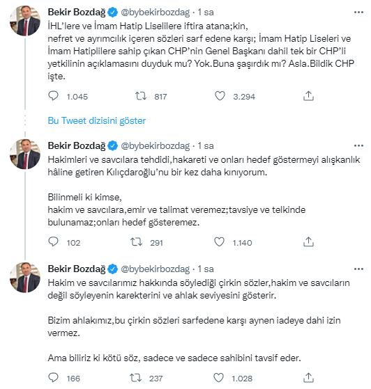 Hakimleri ve savcılara tehdidi, hakareti ve onları hedef göstermeyi alışkanlık hâline getiren Kılıçdaroğlu’nu bir kez daha kınıyorum. Bilinmeli ki kimse, hakim ve savcılara, emir ve talimat veremez; tavsiye ve telkinde bulunamaz; onları hedef gösteremez.