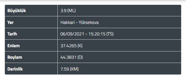 AFAD'dan yapılan açıklamada Hakkari'nin Yüksekova ilçesinde saat 15.20'de 3,9 büyüklüğünde deprem meydana geldi.