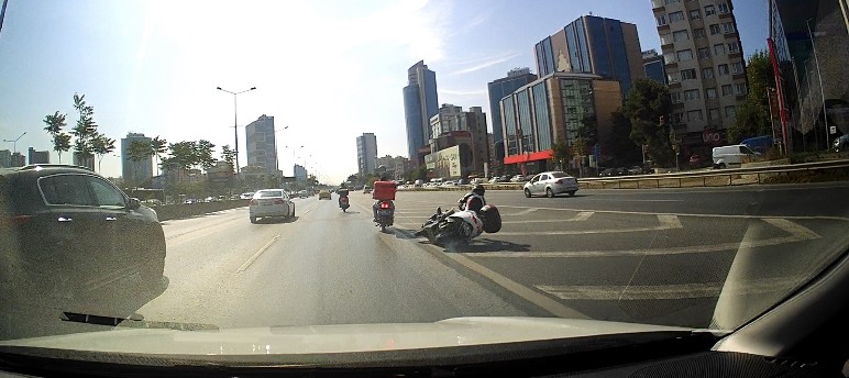 Motosikletlilerin E-5'te güvenlik önlemi almadan ilerlediği sırada, halat yardımıyla çekilen motosikletin sürücüsü dengesini kaybederek bir anda yola düştü. O sırada motosikletin arkasından gelen otomobilin süratli olmaması olası bir kazayı önlemiş oldu. Halat ile çekilen motosikletteki sürücünün düşmesi trafikte yürekleri ağza getirdi.