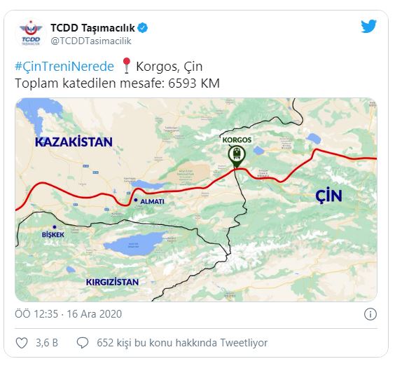 TCDD'ye ait resmi Twitter hesabından Türkiye'nin ilk ihracat trenine ilişkin bir açıklama yapıldı. #ÇinTreniNerede etiketinin kullanıldığı paylaşımda, Türkiye'nin ilk ihracat treninin Çin'deki Korgos şehrine ulaştığı ve toplamda katettiği mesafenin 6 bin 593 kilometre olduğu beyan edildi.